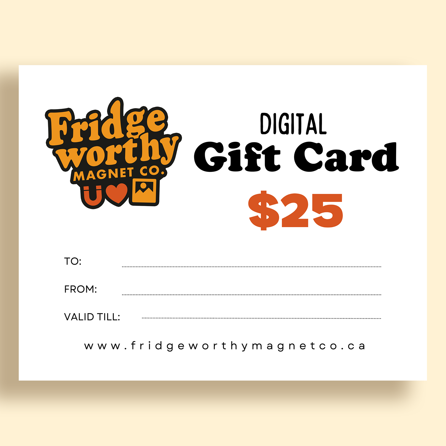 Fridgeworthy digital gift cards make gifting simple, thoughtful, and stress-free. Delivered instantly by email, our gift cards let recipients create custom photo magnets using their own photos, designs, or artwork - perfect for preserving meaningful moments. Whether you’re shopping for a birthday, holiday, housewarming, teacher gift, or last-minute surprise, a Fridgeworthy gift card offers flexibility while still feeling personal. Every magnet is professionally printed and pressed in Canada, ensuring high-quality results you’ll be proud to give.